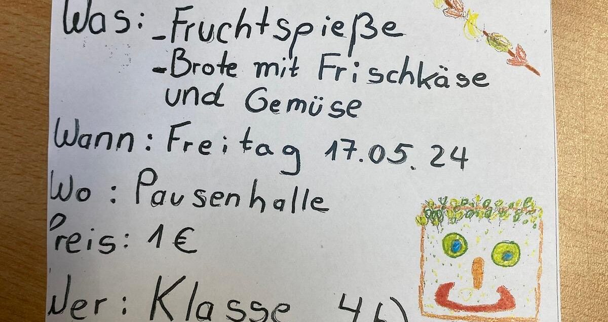 Die Aktion wurde von den Schülerinnen und Schülern dee 4. Klasse mit Unterstütztung von Frau Herdner weitestgehend selbständig organisiert. Die Plakate wurden hergestellt und aufgehängt. Auch der Verkauf sowie die Zubereitung wurde von der Klasse selbst durchgeführt. Die leckeren Brote kamen sowohl bei den Lehrkräften als auch bei den Schülerinnen und Schülern sehr gut an.