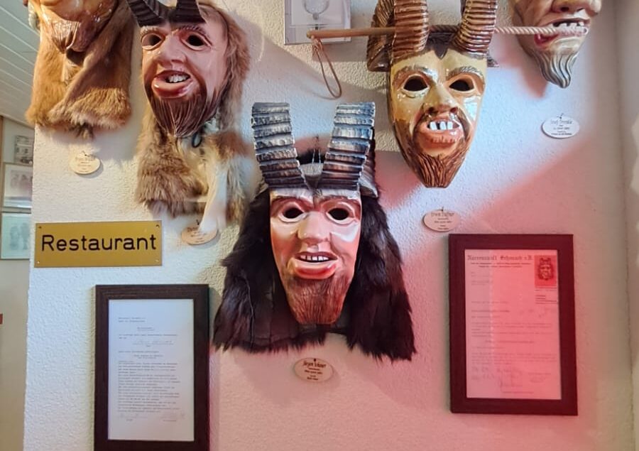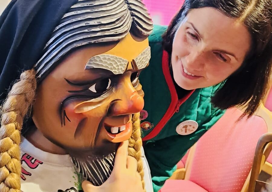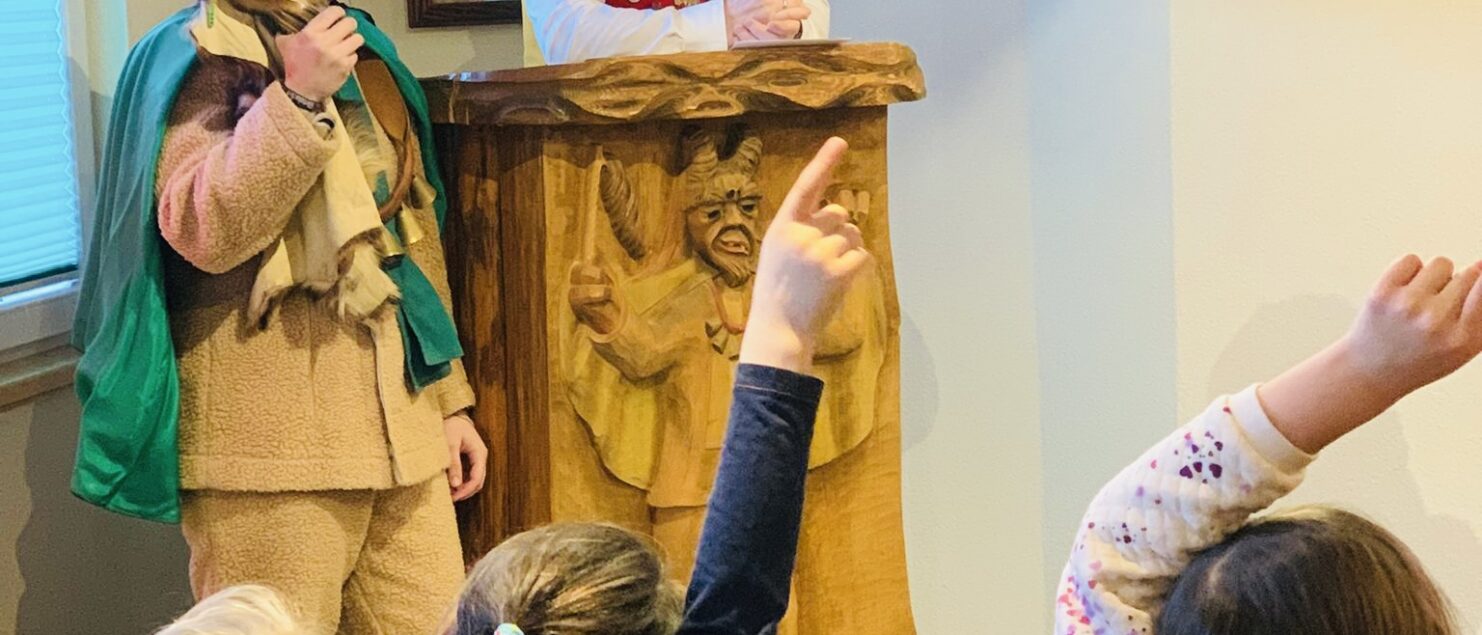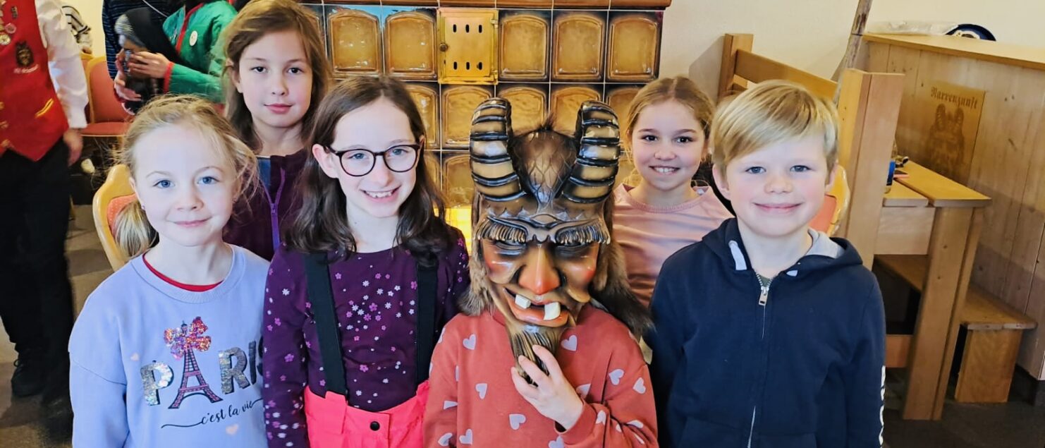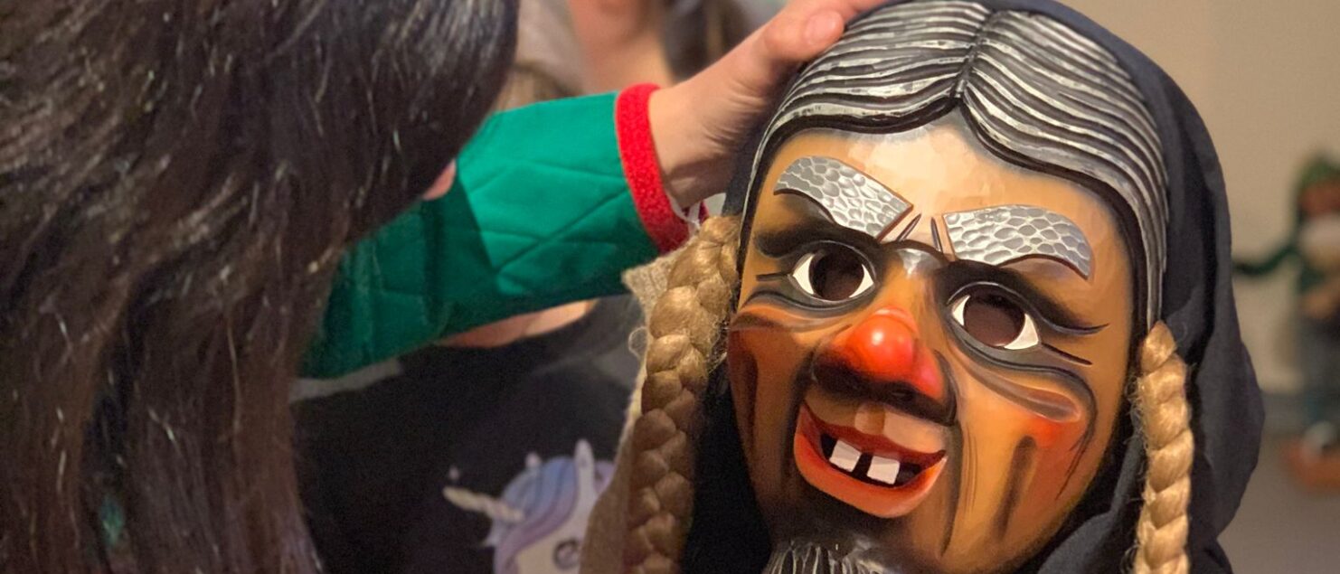 Ein besonderes Highlight war, dass die Kinder die Masken der Geißenmagd, des Geißenmeckerers und der Hexe nicht nur aus der Nähe betrachten, sondern sie sogar aufsetzen durften.