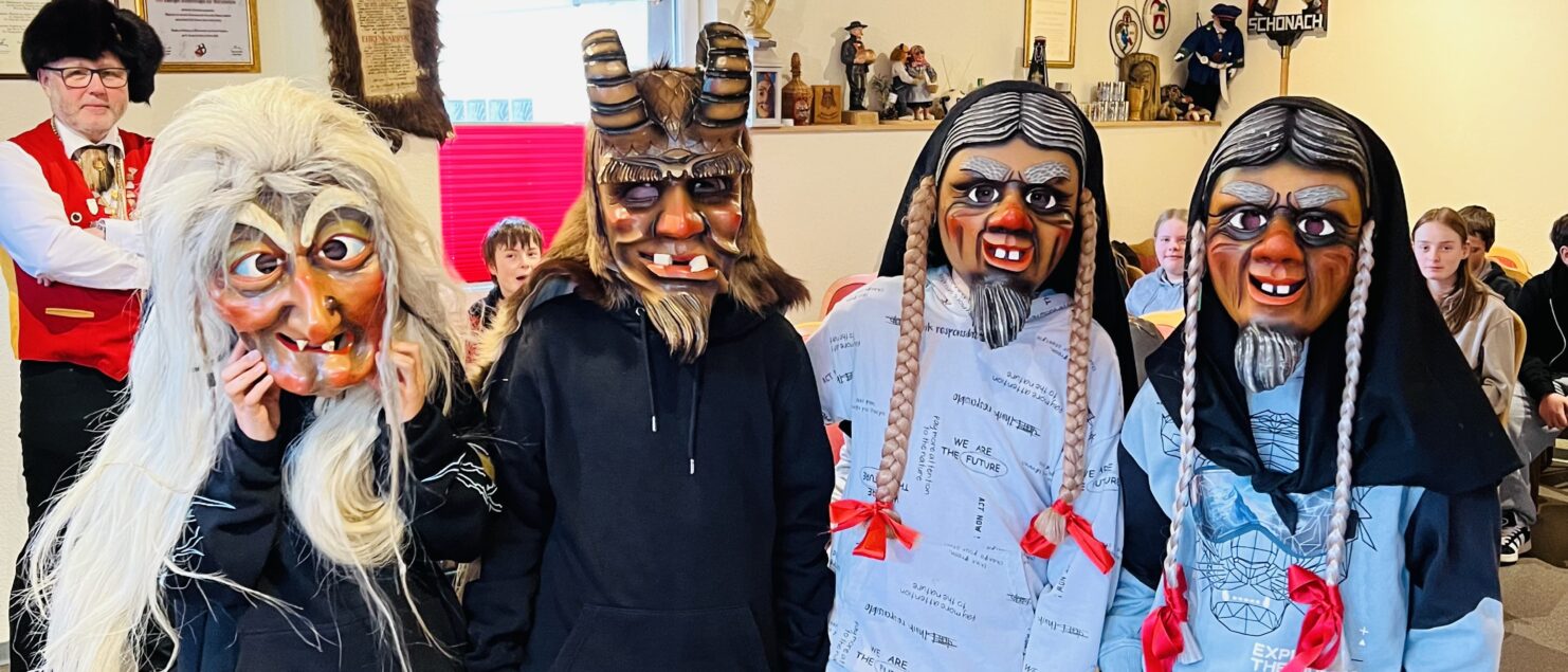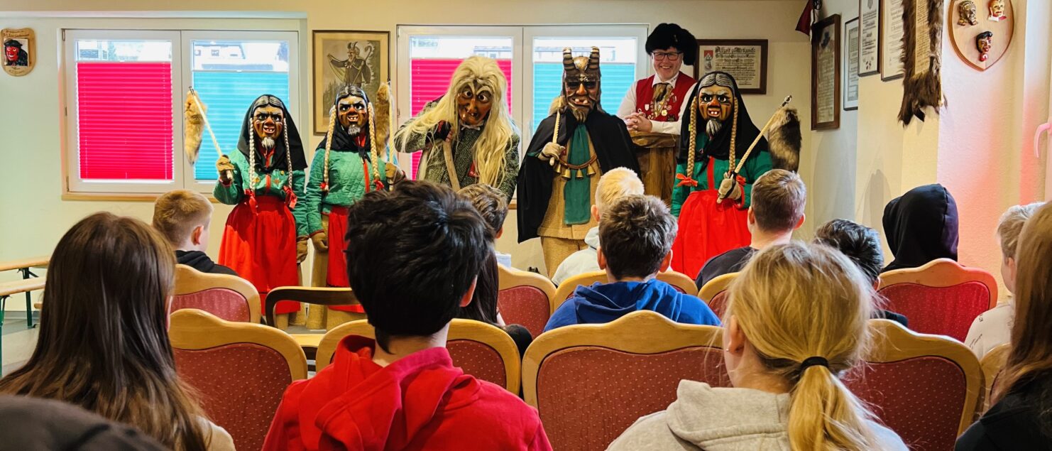 Für viele Schülerinnen und Schüler ist das Brauchtum der Fasnacht etwas Unbekanntes und teilweise sogar angsteinflößend. Der Vorsitzende der Narrenzunft, Jonny Kienzler, gab den Schülerinnen und Schülern spannende Einblicke in die Entstehung und Geschichte der Schonacher Fasnachtstradition.
