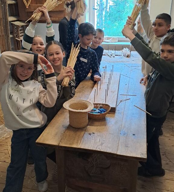 Die Projektleiterin der Naturparkschule Ingrid Schyle brachte zusammen mit Kathrin und Hannah Kimmig sowie mit Andrea Dotter den Kindern anschließend das Flechten bei und erklärten die Techniken, die seit Jahrhunderten zur Herstellung von Strohwaren genutzt werden. Die Schülerinnen und Schüler erlebten hautnah, wie viel Geschick und Ausdauer für dieses Handwerk erforderlich waren und fühlten sich wie in einer alten Geflechtschule.