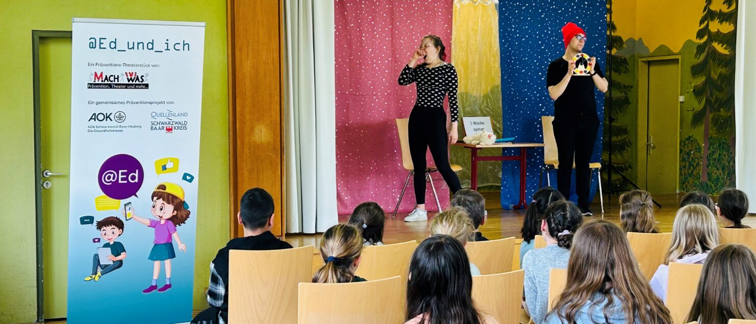 Am Mittwoch, den 4. Juni, war das Medienpräventionstheater “@Ed_und_ich” an der Dom Clemente Schule zu Gast. Das interaktive Theaterstück ist Teil des neuen Präventionsprojekts zur Stärkung der Medienkompetenz von Kindern, das vom Landratsamt Schwarzwald-Baar-Kreis in Zusammenarbeit mit der AOK Schwarzwald-Baar- Heuberg ins Leben gerufen wurde.