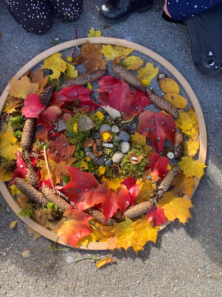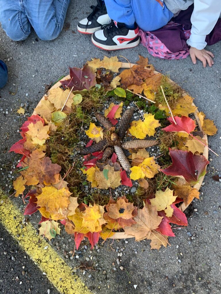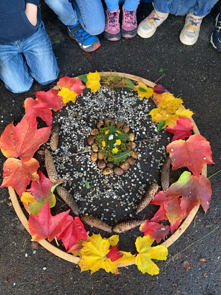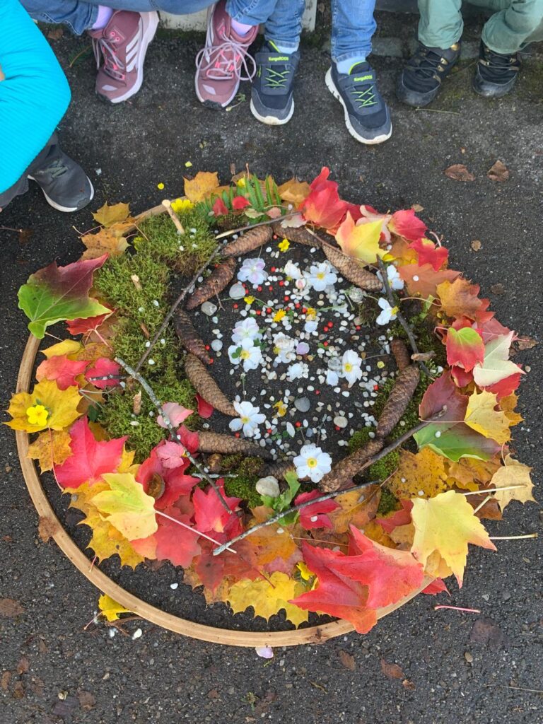 Aus Naturmaterialien hergestellte Mandalas der 1. Klassen.
