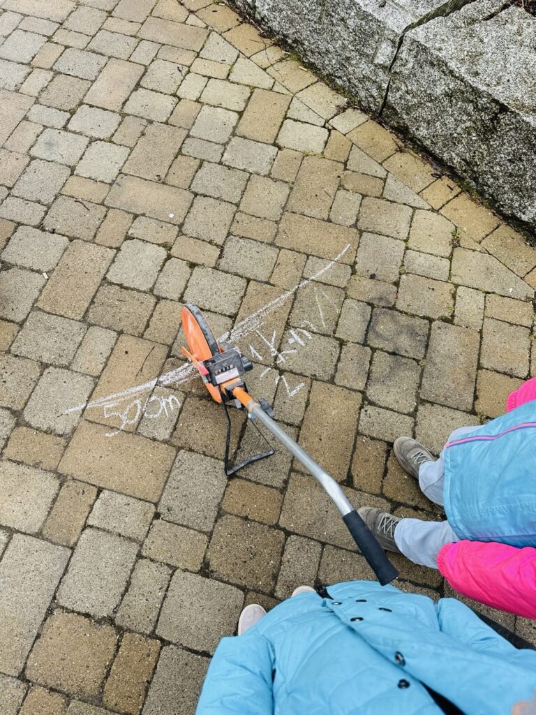 Wie lang ist 1km? Mathematikunterricht im Dorf. Die Kinder der Klasse 3 entdeckten mit einem Messrad, wie lang ein Kilometer ist.