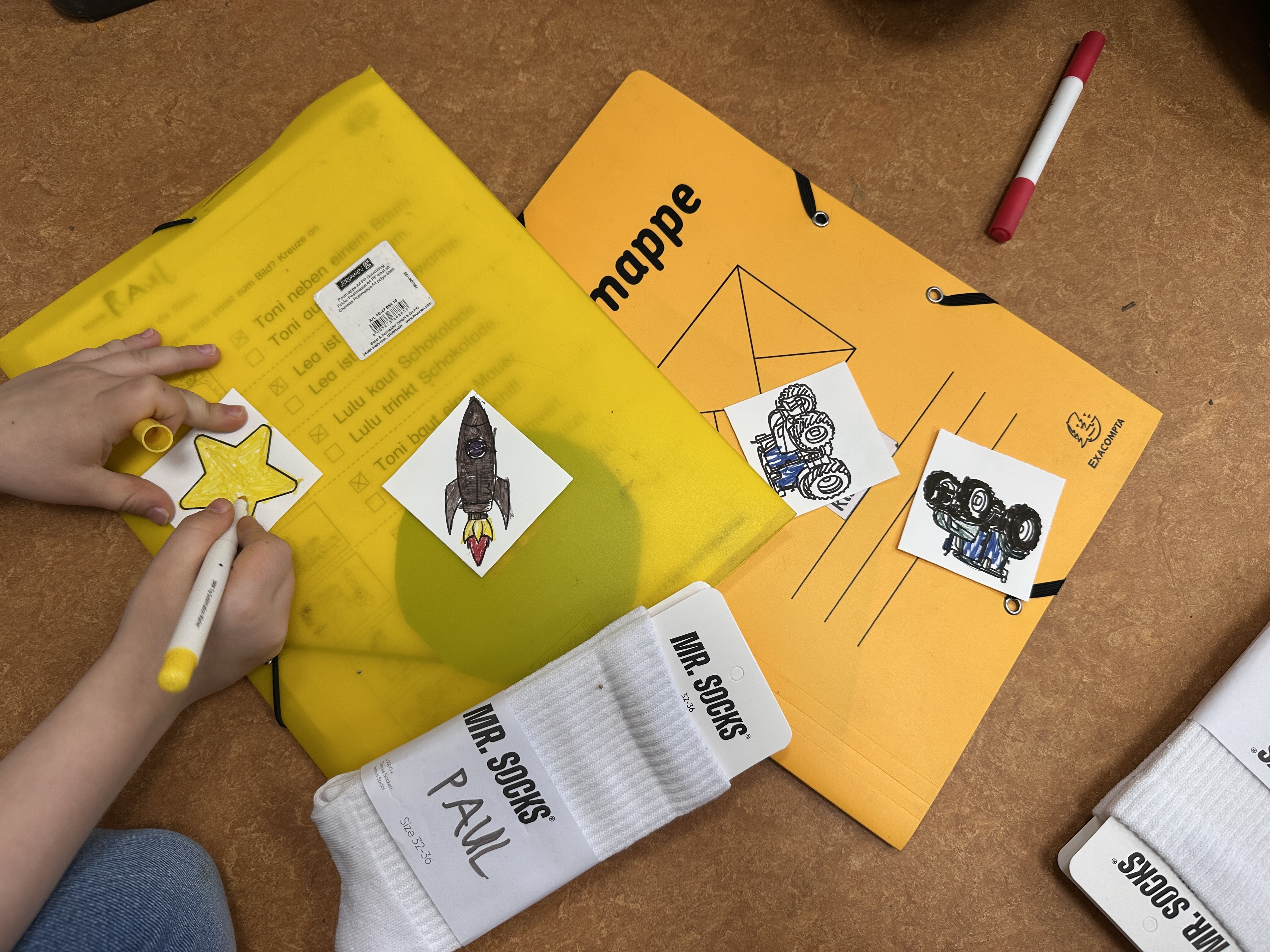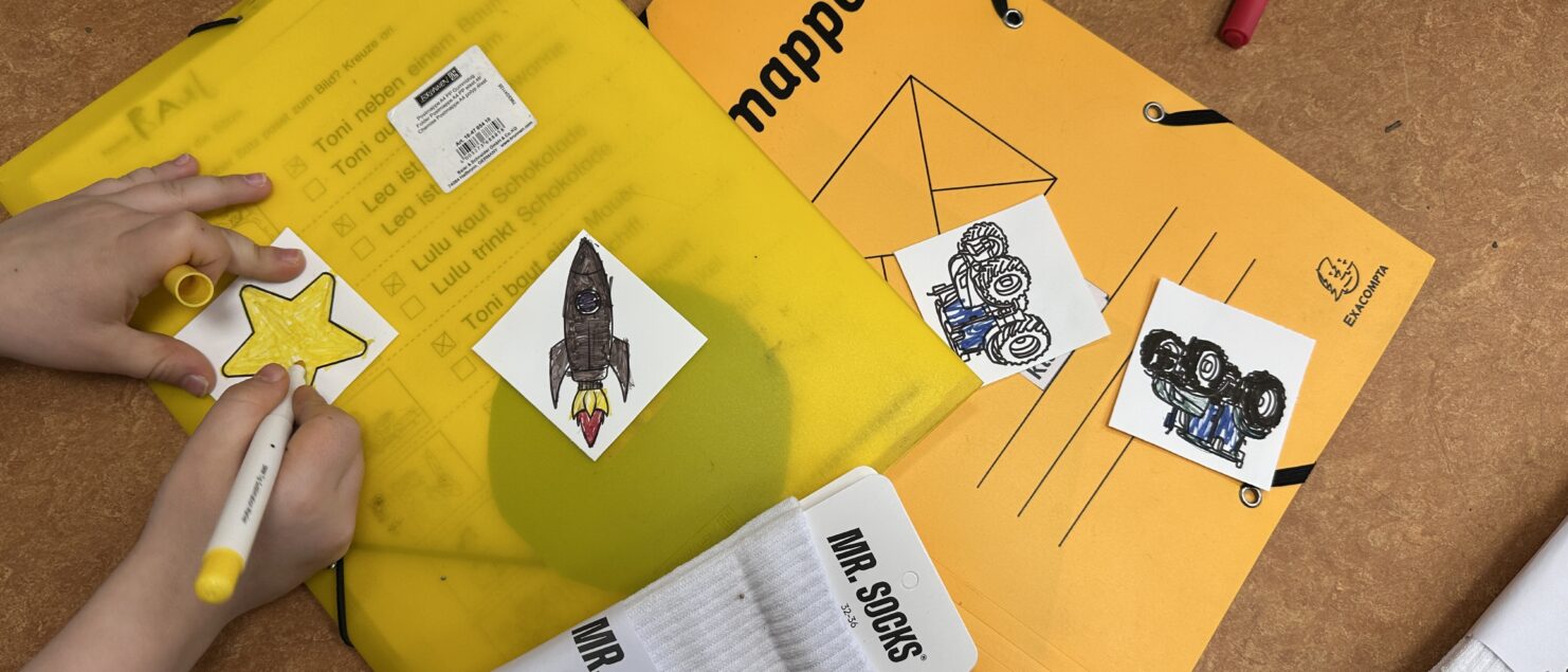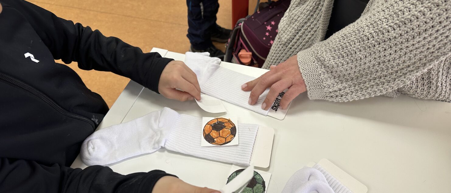 Die Schülerinnen und Schüler gestalteten mit viel Freude die Bildchen für ihre eigenen Socken. Dabei konnten sie aus verschiedenen Vorlagen wählen und ihre Ideen individuell umsetzen. Es wurde konzentriert gearbeitet, viel gelacht und mit großer Sorgfalt gemalt. Die Ergebnisse können sich jetzt schon sehen lassen!