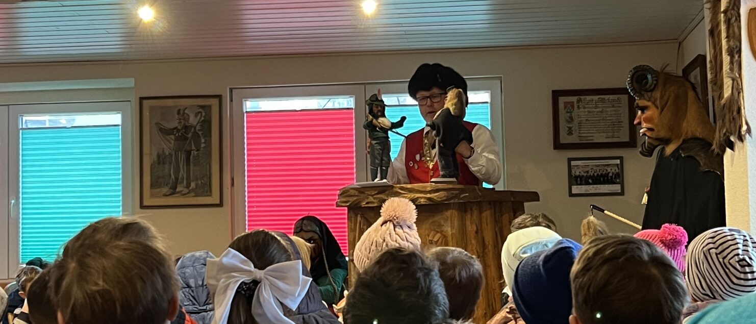 Am 25. Januar 2024 hatten die Schülerinnen und Schüler der Klassen 1 bis 6 auf Anregung der Dom Clemente Schule hin erstmalig die Möglichkeit, die Schonacher Fasnet hautnah im heimischen „Geißenstall“ kennenzulernen. Sowohl Ozumei Johnny Kienzler als auch drei weitere Hästräger und Hästrägerinnen der Narrenzunft Schonach erklärten anschaulich die Geschichte des Geißenmeckerers und der Geißenmagd. Besonders gerne wurde das Angebot angenommen, die handgeschnitzten Masken einmal anzuprobieren. Während einige Kinder selbst als Hästräger mit den teils schaurigen Figuren der Narrenzunft vertraut sind, war es für viele andere die erste Gelegenheit, sich alles in Ruhe anzuschauen und eventuell vorhandene Ängste insbesondere vor der Zunfthexe abzulegen. So konnten alle neue Einblicke in die wilde und bunte Fasnetszeit gewinnen. Wir bedanken uns herzlich für das Engagement der Narrenzunft Schonach.